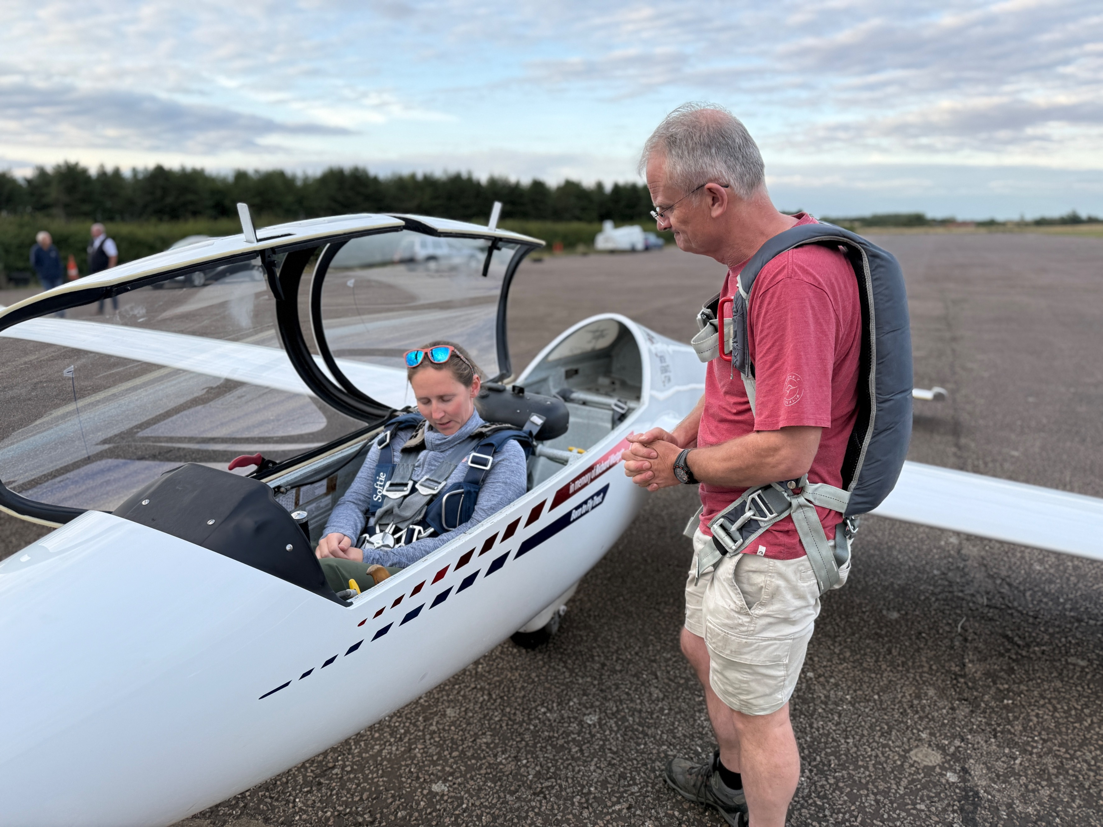 With good evening weather, Luca kindly stayed late to tow us. Laura and Neil both took flights in the Fox before it was trestled for the night, followed by a late dinner and debrief.Over the weekend, the Fox became the focus. Its role was twofold: to give squad members the experience needed to transition safely to the SZD-59 when it arrived, and to provide advanced-level coaching. By the end, almost everyone had been cleared to fly the SZD-59—with some figure and family limitations in place. Neil was authorised for all Sports plus